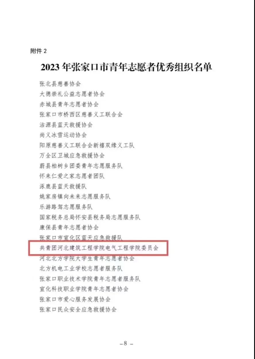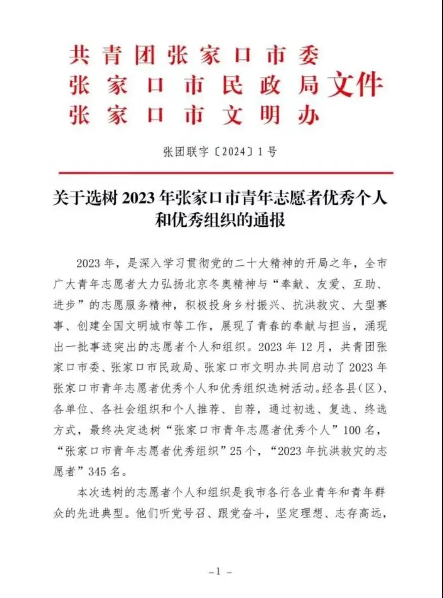 近日,由共青团张家口市委、张家口市民政局、张家口市文明办下发的《关于选树2023年张家口市青年志愿者优秀个人和优秀组织的通报》,MK体育团委荣获“张家口市青年志愿者优秀组织”称号。