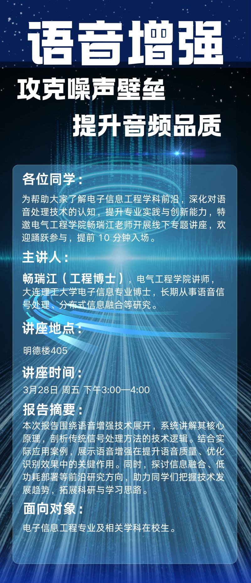 MK体育“专业教育与交流”系列学术讲座第三讲预告:《语音增强:攻克噪声壁垒,提升音频品质》