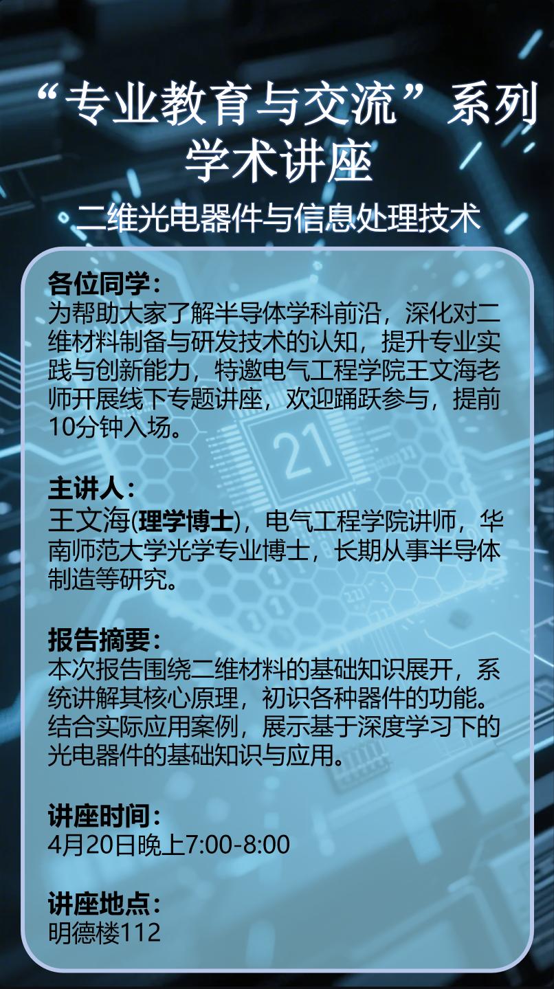 MK体育“专业教育与交流”系列学术讲座第六讲预告: 《二维光电器件与信息处理技术》
